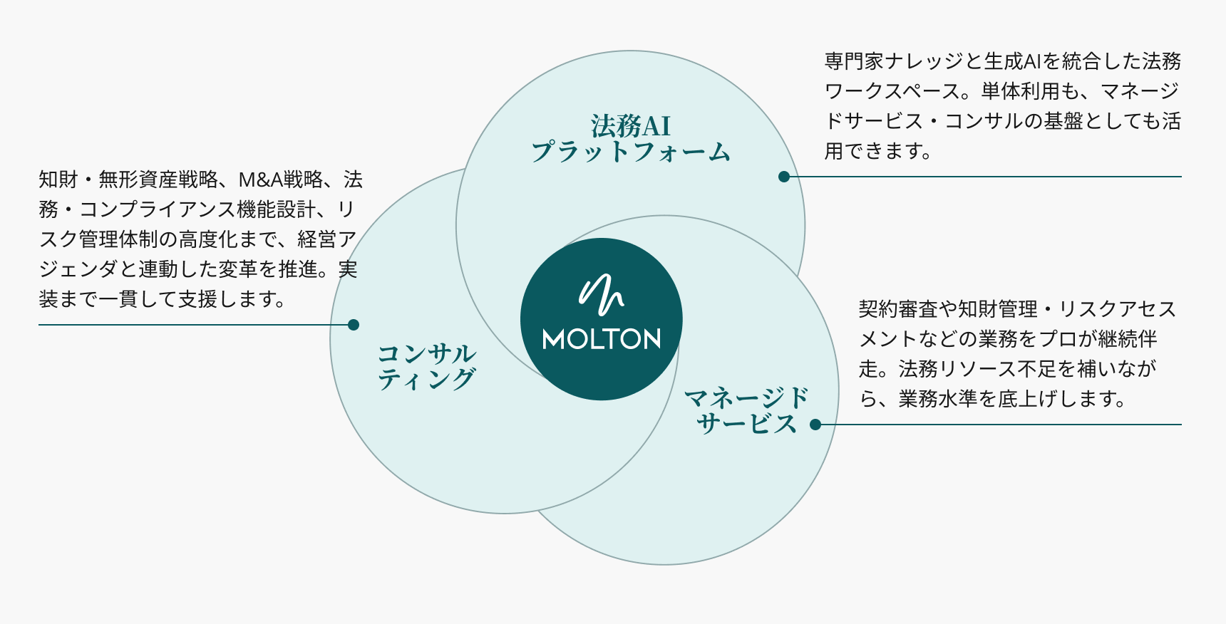 Moltonは、「法務AIプラットフォーム」「マネージドサービス」「コンサルティング」を、