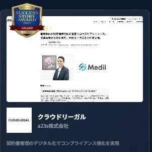 生成AI搭載のBPaaS:企業法務アウトソーシングサービスALSP(代替法務サービスプロバイダー)の国内パイオニアで、バーチャル法律事務所「クラウドリーガル」(URL:https://www.cloudlegal.ai/)を提供している、a23s株式会社(所在地:東京都中央区、代表取締役、弁護士「日本・米国NY州」﨑地康文、以下a23s)は、この度『デジタル化の窓口』を運営する株式会社クリエイティブバンク(本社:東京都千代田区)が発表した「SUCCESS STORY AWARD 2025 byデジタル化の窓口」のガバナンスDX部門でクラウドリーガルの導入事例がAWARDに受賞したことをお知らせします。
