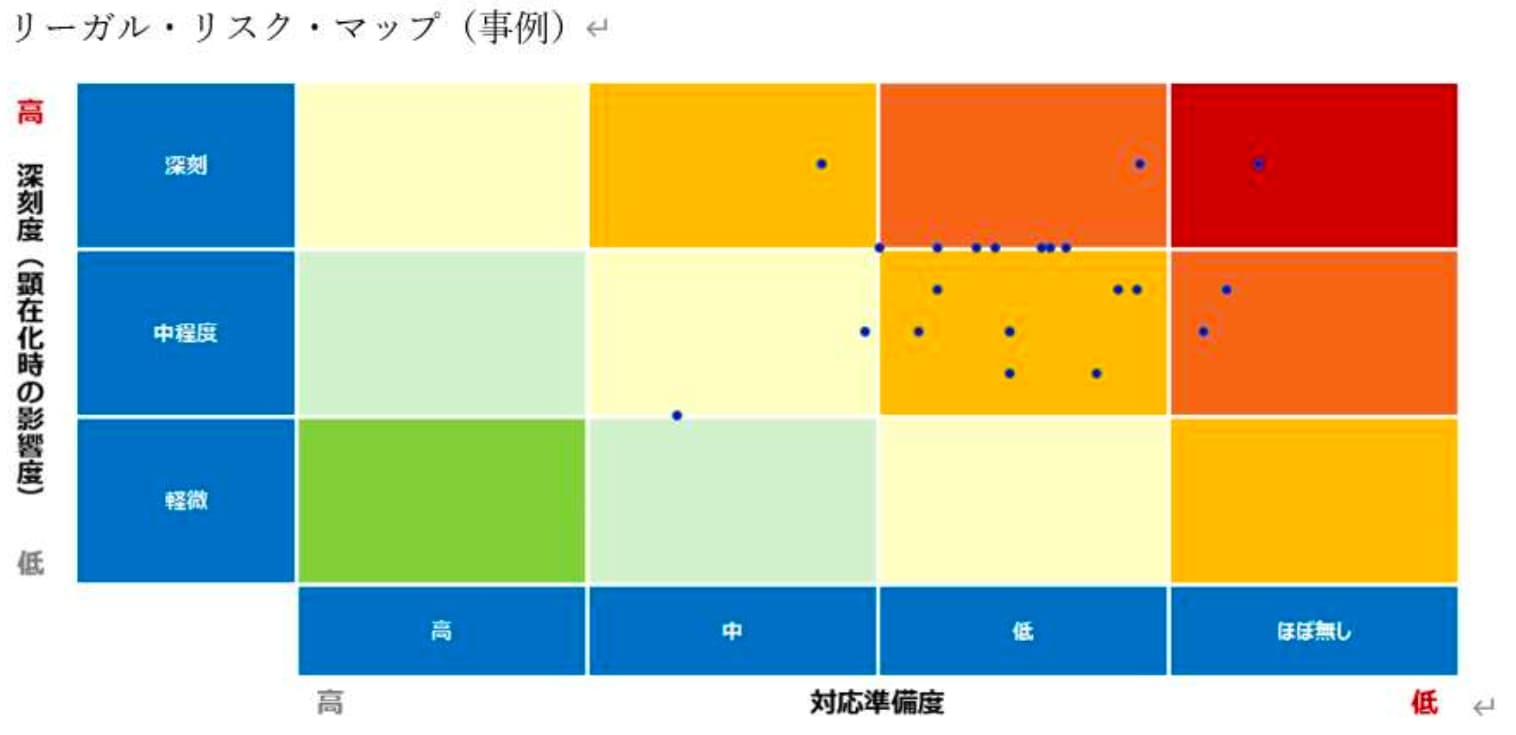 従来のリーガルリスク・マネジメントの考え方では、全ての法的リスクを完全に除去したり、その顕在化を完全に予防したりすることが目的ではないという前提に立ち、対応すべき法的リスクの重要度をその大きさ(影響結果:Impactの大きさと、発生し易さ:Probabilityのマトリクスによる)の順で決め、適切な対策を講じれば取れるリスクと、そもそも取れないリスクとを峻別したうえで優先順位を付けて処理するというものでした。